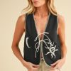 An embroidered tied front vest coat is a chic and stylish outerwear piece featuring intricate embroidery details and a tied front closure. This vest coat adds a touch of elegance and sophistication to your outfit, making it a perfect choice for layering over different tops and dresses. The tied front design allows you to cinch the waist for a more defined silhouette. This versatile garment can elevate your look with its unique design and added flair.