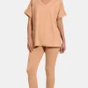 The V-neck rolled short sleeve t-shirt and leggings lounge set offers the perfect blend of comfort and style for a laid-back day. The V-neck design adds a touch of sophistication to the casual look, while the rolled short sleeves provide a relaxed and effortless vibe. Paired with the snug and stretchy leggings, this set is ideal for lounging at home or running quick errands. The soft and comfortable fabric ensures all-day comfort and ease of movement. Whether you’re relaxing indoors or stepping out for a casual outing, this lounge set provides a versatile and chic outfit option. Embrace a look that balances comfort and style with the V-neck rolled short sleeve t-shirt and leggings lounge set for a cozy and fashionable ensemble.
