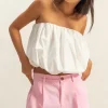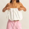The trendy Strapless Bubble Top is a stylish and chic piece that features a strapless design and a bubble hem for a modern look. This top adds a touch of elegance and sophistication to any outfit, making it a versatile choice for various occasions.