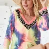 The Tie Dye Terry V Neck Top is a must-have for a casual yet trendy look. The tie dye pattern adds a fun and playful element to the classic V-neck top style. Made from soft and comfortable terry fabric, this top is perfect for lounging or running errands in style. The V-neck design adds a flattering touch to your neckline, making it a versatile piece that can be dressed up or down. Embrace the tie dye trend with this chic and effortless top for an on-trend outfit.