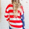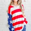 The American flag long sleeve sweater top is a patriotic and stylish choice for showing off your American pride. The flag design adds a bold and eye-catching element to the sweater, making it perfect for holidays like Independence Day or any day you want to show your patriotic spirit. The long sleeves provide warmth and comfort, while the sweater material adds a cozy and relaxed feel. This sweater top is a fun and festive option for casual gatherings or celebrations where you want to showcase your love for your country.