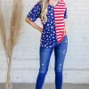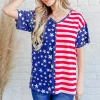 This top features a patriotic American flag design on the front, perfect for showing off your national pride. With short sleeves, it’s ideal for casual wear during patriotic holidays or everyday summer styling. Pair it with denim shorts or jeans for a festive and laid-back look.
