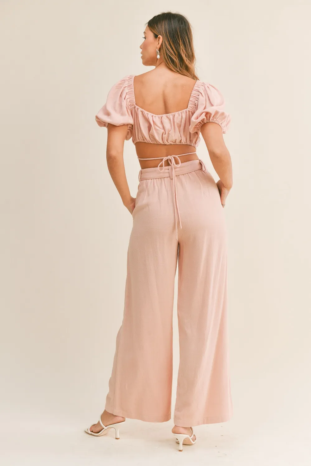 Cut Out Drawstring Crop Top and Belted Pants Set – Dusty Pink