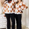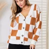 Stay cozy and chic with this checkered button-up V-neck dropped shoulder cardigan. The checkered pattern adds a trendy and eye-catching element to this classic cardigan, while the button-up design allows for versatile styling options. The dropped shoulder design adds a relaxed and comfortable fit, perfect for layering or wearing on its own. Stay stylish and warm with this must-have checkered cardigan.