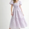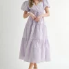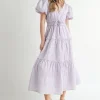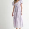Eyelet Lace Puff Sleeve V Neck Midi Dress – Lavender
