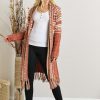 The Fringe Hem Aztec Cardigan is a stylish and bohemian-inspired piece featuring an Aztec pattern and fringe hem detailing. This cardigan adds a touch of tribal flair to your outfit while providing a cozy and chic layering option. The fringe hem adds movement and texture, making it a versatile and eye-catching addition to your wardrobe for a stylish and relaxed look.