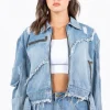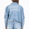 Full Size Distressed Frayed Edge Zip Up Denim Jacket Plus Size – Light Blue