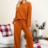 Full Size Fuzzy Hacci Brush Round Neck Top and Pants Lounge Set – Rust