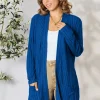Full Size Ribbed Open Front Cardigan with Pockets – Dark Blue