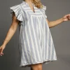 Full Size Striped Notched Ruffled Cap Sleeve Mini Dress Plus Size – Light Blue