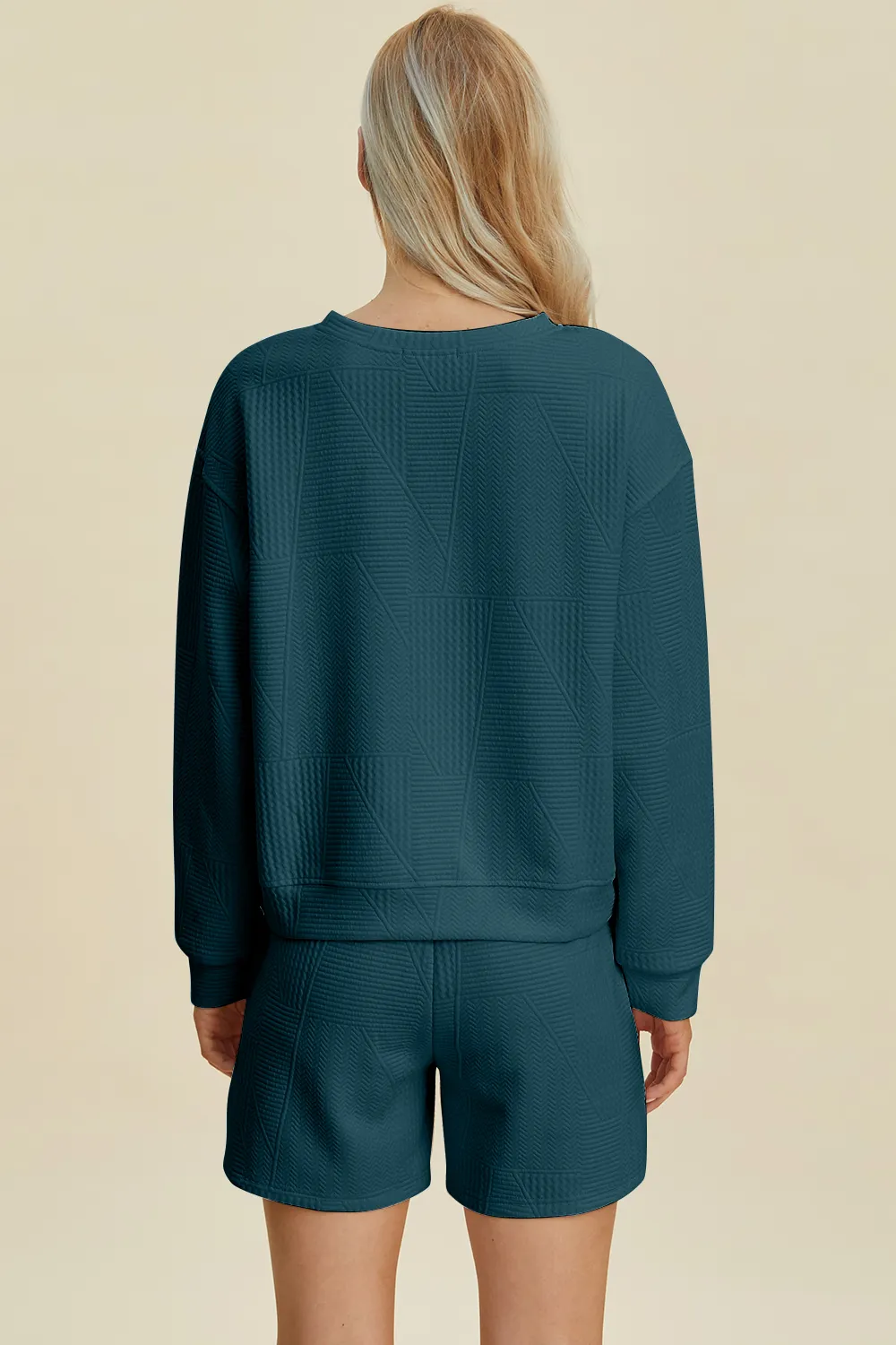 Full Size Texture Round Neck Long Sleeve Top and Shorts Set – Peacock Blue