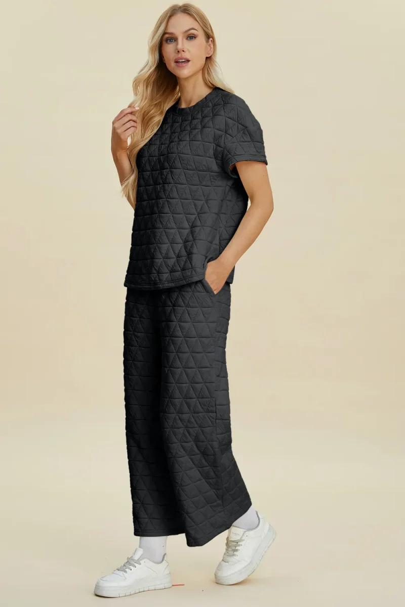 Full Size Texture Round Neck Short Sleeve Top and Pants Set – Black