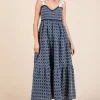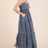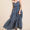 Geometric Embroidered Smocked Tie Shoulder Midi Dress – Dark Blue