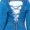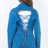 A denim laced back cropped jacket features a button front closure, cropped length, and laced back trims. This stylish piece offers a unique twist on the classic denim jacket silhouette, adding a touch of modern flair to your outfit. The button front closure provides a secure fit, while the cropped length offers a trendy and versatile look. The laced back trims add a playful and eye-catching detail, perfect for those looking to make a fashion statement. Whether paired with jeans for a casual day out or layered over a dress for a night out, this jacket is sure to elevate your style effortlessly. Add a denim laced back cropped jacket to your wardrobe for a chic and on-trend piece that you’ll love to wear.