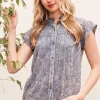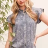 Achieve a casual and effortlessly stylish look with this mineral wash flutter sleeve button-down shirt. The mineral wash gives the shirt a relaxed and lived-in vibe, while the flutter sleeves add a feminine and playful touch. The button-down design offers a versatile and classic look that can be dressed up or down. Pair it with your favorite jeans or shorts for a chic and laid-back ensemble. Embrace a trendy and comfortable style with this versatile shirt.