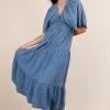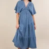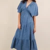 Mineral Washed Elastic Neck Detail Midi Dress – Denim