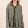 The Mineral Washed Plaid Button-Down Shacket is a versatile and trendy piece that combines the comfort of a shirt with the warmth of a jacket. The mineral-washed plaid design adds a vintage and edgy touch to the classic button-down style. Perfect for layering over a basic tee or sweater, this shacket is ideal for adding a stylish flair to your outfit during the cooler months