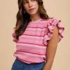 Multi Stripe Ruffle Sleeve Textured Knit Top – Pink