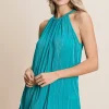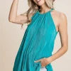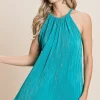 The Pleating Knit Halter Neck Top is a sophisticated and stylish piece that features pleating details and a halter neckline. The pleating adds texture and visual interest to the knit fabric, creating a more dynamic and elegant look. The halter neckline is flattering and adds a touch of chicness to the top. This top is versatile and can be dressed up or down for different occasions. Pair it with tailored pants or a skirt for a polished and dressy outfit, or with jeans for a more casual yet fashionable look. The combination of pleating, knit fabric, and halter neckline makes this top a refined and stylish addition to any wardrobe.
