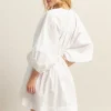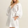 Plunge Balloon Sleeve Poplin Mini Dress with Pockets – White