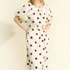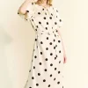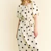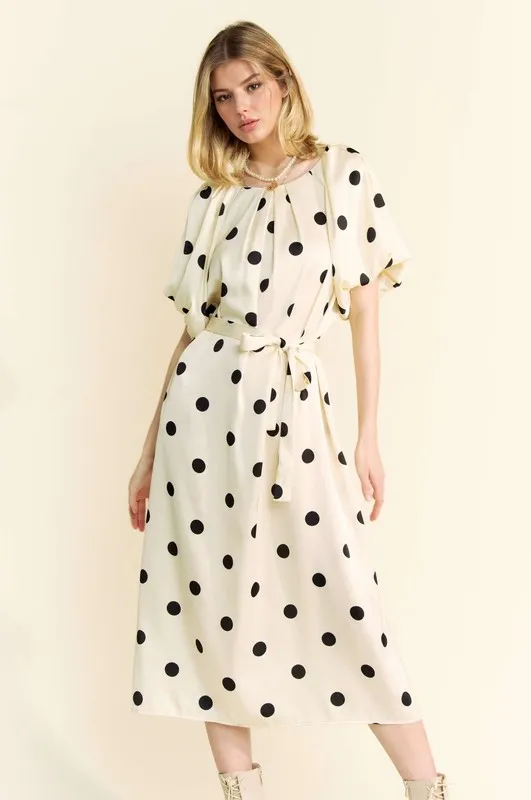 Polka Dot Puff Sleeves Waist Tie Midi Dress – Cream