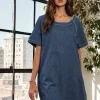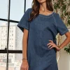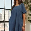 Raw Hem Mini Denim Dress With Pockets – Dark