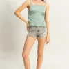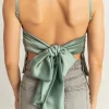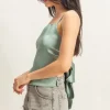 The satin back tie detail cami is a sophisticated and luxurious piece that adds a touch of elegance to your outfit. The satin fabric offers a silky and smooth texture, perfect for dressing up any look. The back tie detail adds a feminine and chic element, allowing you to adjust the fit to your liking. This cami is versatile and can be styled in various ways – wear it alone with jeans or dress it up with a blazer and trousers for a more formal look. The satin fabric and tie detail create a sleek and stylish ensemble that is perfect for both casual and dressier occasions.