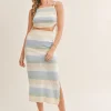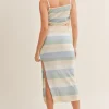 The striped knit cami and midi skirt set is a trendy and coordinated outfit that offers both style and comfort. The striped pattern adds a chic and playful touch to the ensemble, creating a fun and stylish look. The cami top provides a breezy and effortless feel, perfect for warm weather days. Paired with the coordinating midi skirt, this set offers a polished and put-together appearance that is versatile for various occasions. Whether worn together or as separates, this set is a versatile addition to your wardrobe. Effortlessly chic and fashionable, the striped knit cami and midi skirt set is a must-have for those seeking a coordinated and on-trend outfit option.