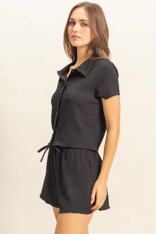 Textured Short Sleeve Top and Drawstring Shorts Knit Set – Black