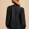 Tie Front Peplum Long Sleeve Denim Top – Black
