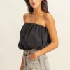 The trendy Strapless Bubble Top is a stylish and chic piece that features a strapless design and a bubble hem for a modern look. This top adds a touch of elegance and sophistication to any outfit, making it a versatile choice for various occasions.