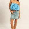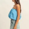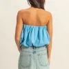 The trendy Strapless Bubble Top is a stylish and chic piece that features a strapless design and a bubble hem for a modern look. This top adds a touch of elegance and sophistication to any outfit, making it a versatile choice for various occasions.
