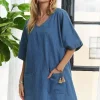 V-Neck Half Sleeve Mini Denim Dress – Peacock Blue